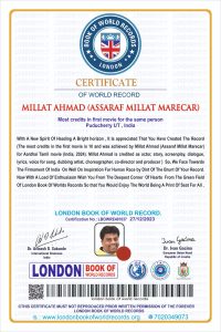 இந்தச் சாதனையைப் பாராட்டி லண்டன் உலக சாதனைப் புத்தகம் மற்றும் இந்தியா உலக சாதனைப் புத்தகம் அங்கீகரித்து பதிவு செய்து உலக சாதனையாளர் சான்றிதழ் வழங்கியிருக்கிறார்கள். புதுச்சேரி மாநிலத்திலிருந்து திரைப்படத் துறையில் சாதித்தவர் என்ற பெயரும் பெற்றார்.